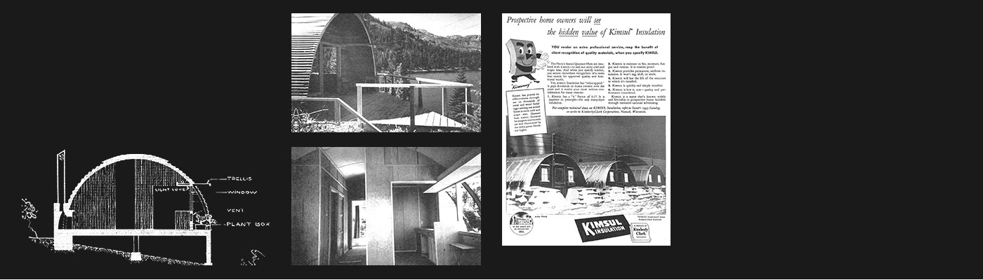 Advertisement for Kimsul insulation featuring its application in US Navy Quonset Huts with mascot “Kimmy” (Arts & Architecture, October 1945, p27).