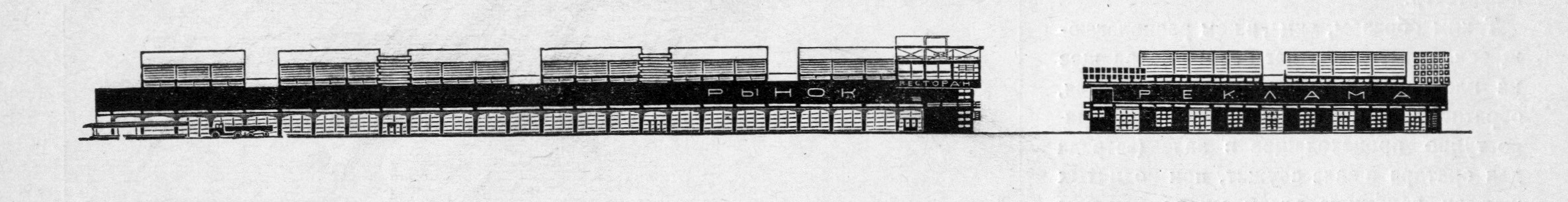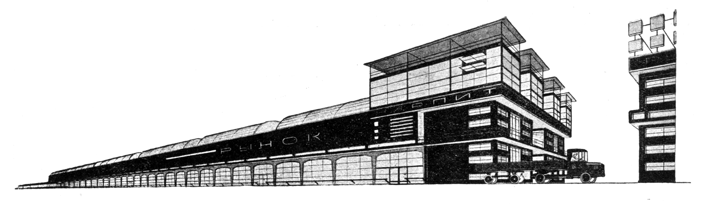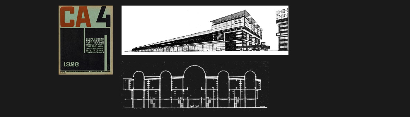 Interspersed in the fourth 1926 issue of Contemporary Architecture (Современная архитектура), student projects from VKhUTEMAS (the legendary Higher Institute for Art and Technical Studies) propose designs for new market halls in Moscow and as well as a palace of labor, one A.L. Pasternak analyzes Erich Mendelsohn’s photos in Amerika (1926), and several prominent practitioners (including Corb, Behrens, and Oud) advise on designing flat roofs in cold climates. The magazine is edited by Moisei Ginzburg and the Brothers Vesnin, and they wedge this curious project for the Smolensky Market Hall in Moscow in between a competition announcement and reader questionnaire: “Comrade, how do you see the material design of the new way of life of the working people and what do you consider the philistinism of things, i.e. their petty-bourgeois essence?”