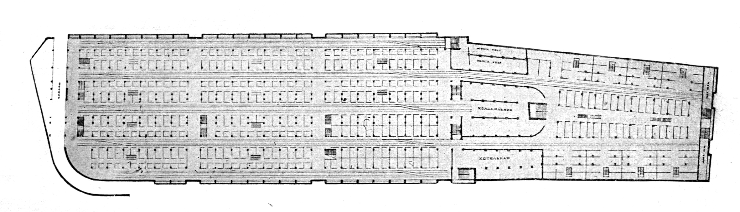 The two above-ground levels are brightly lit with long, barrel-vault shaped, glass-and-steel roofs. The blocks of the market stalls are disposed around these five glass roofs with two-story galleries that fill the halls with light. In contrast, light does not penetrate to the basement level. While the basement plan seems to repeat the grid of market stalls from the ground floor, the lack of light makes its use less certain. In plan we can see the curved access ramp for trucks and rail tracks which crisscross down the main aisles. In section, Golosov has drawn these for cargo-carts. These rails and ramp suggest that the lowest level is less for the retail sale of merchandise rather than the loading, unloading, and transport of wholesale cargo. Golosov has not labeled the drawings for us.