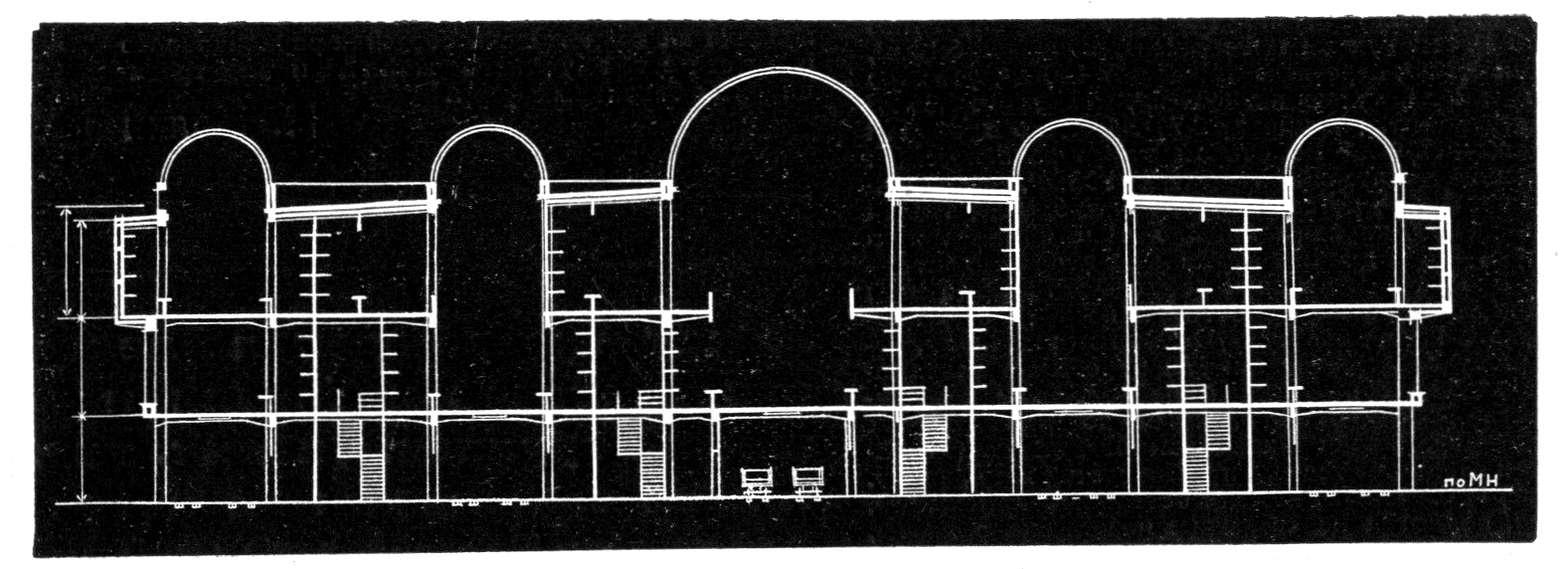 In these projects, special attention was paid to maximum hygiene in the storage and sale of products. Handling and local transport are kept to a minimum, as the produce goes directly from external unloading platforms through sanitary inspection points to the market halls. The sold goods are conveyed through conveyors running under the floor into packaging rooms and places of issue. From there, through hatches in the floor, it is loaded onto cars or carts […] profitability is taken into account both in the construction and operation of a large, free-standing refrigeration base with a special unloading platform, a light connecting corridor-overpass above the market, and a powerful compressor unit that partially cools the market basements.