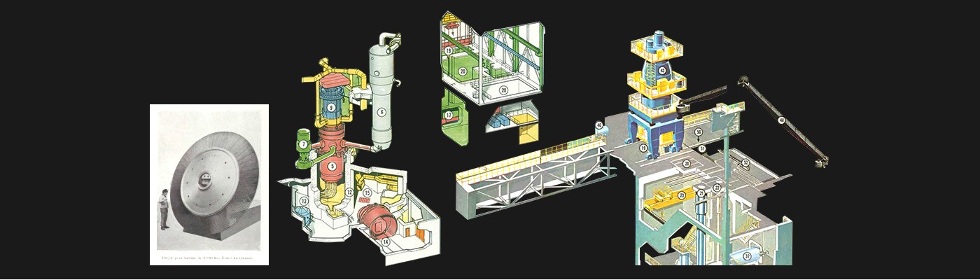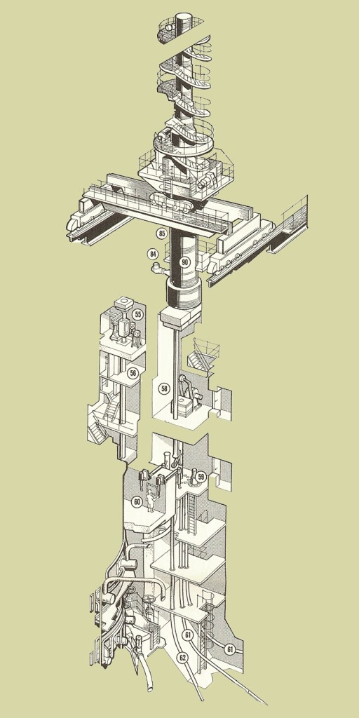 Employing the technique of cut-away two- and three-point perspective, they unveil in lavish detail the complex systems and sublime spaces of atomic power generation. They use airbrushed retro colors. They provide little scientists in lab coats to show scale. They – at different moments – prioritize the knotted ductwork which sustains the reactors and the pure industrial volumes which contain them. The imagination and skill of the illustrators cannot be overstated as they had to both construct a complex perspectival composition – often using just technical drawings provided by the reactor designers – and then deconstruct that same image in order to reveal the inner workings.