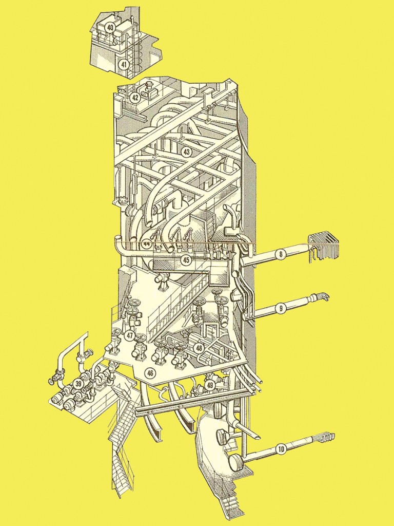 In any given chart, the eye is presented with a veritable I-spy of rooms, pipes, gantries, and typically several feet of pre-stressed concrete. If the original charts are overwhelming, the thesis of the following images is that they can be further appreciated by a naïve act of cropping. We can focus on a single Piranesian vignette or medusa-like system. We can allow the ingenious construction of the section plane cuts to read through the flatness of the new whitespace. Pre-Three Mile Island, pre-Chernobyl, these drawings are full of the atomic energy optimism which – to lay my cards on the table – is likely a necessary part of de-carbonization. This is the first set in the series which I hope to continue.