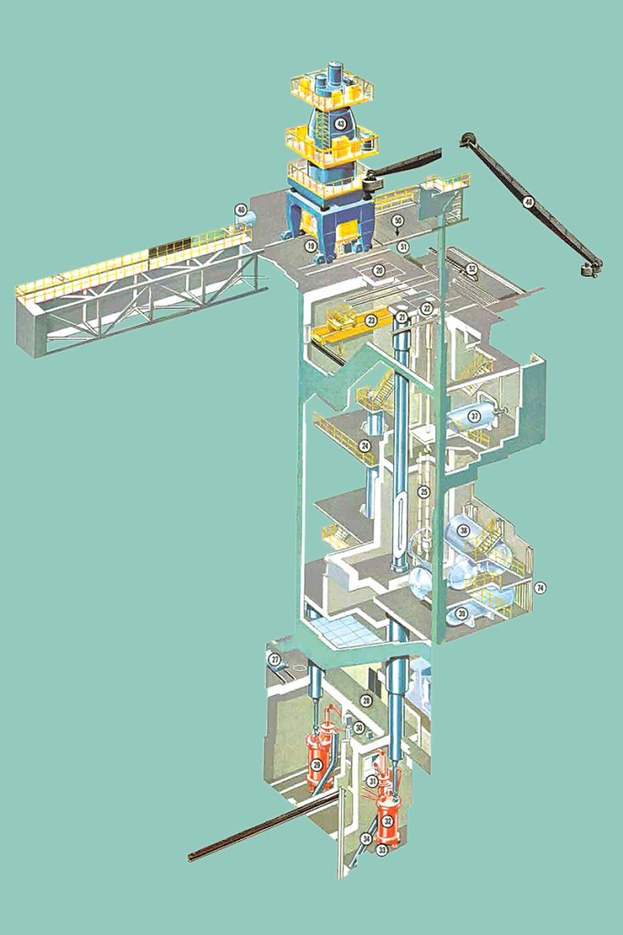 St. Laurent des Eaux Units A1 and A2. Construction: 1963-1969. Operation: 1969-1990/91. 2x UNGG Type Reactors: Graphite Moderator, Carbon Dioxide Coolant, Natural Uranium Metal Fuel. Nominal Power: 390/450 MWt ea. / Draftsman: R. John Way / 19. Spent fuel discharge position – south 20. Access to service bay 21. Spent fuel discharge position – north 22. Access to test bay 23. Service station bridge crane 24. Service station 25. Test station 27. Supply conveyor for rotating fuel manipulator 28. Room for loading lock-chamber with new fuel 29. South lock chamber 30. Control station for lock-chamber 31. Rotating fuel manipulator 32. North lock chamber 33. Shock absorber 34. Chutes 37. Tanks for shut-down heat exchangers 38. Raw water containers 39. North transfer tanks 40. Concrete vessel coolant tanks 43. Charge machine 48. Charge machine control – compass arms 50. Handling shaft 51. Charge machine transporter 52. Transporter control 74. Skirt
