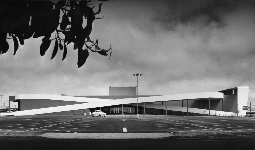 Before he became the architect of the North American shopping mall, Victor Gruen designed the Westchester, Los Angeles branch of Milliron’s department store. Typologically, this store was neither fish nor fowl. While it’s emblematic of the centrifugal movement of retail into the suburbs (the flagship Milliron’s was located in downtown LA) and responds to the dominance of the automobile, this department store still imagined a mini-urban condition with retail clustered around the sidewalks at the corner of Sepulveda and La Tijera Boulevards. Within five years it would be superseded by the shopping mall model elsewhere in the city, the same type of which Gruen would become master in short time. The building is extant, but heavily modified. Today it houses a Kohl’s: a big box store, another suburban retail type.