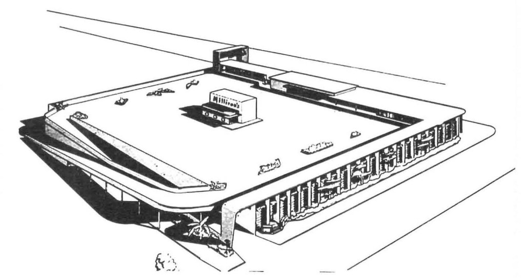 The one story layout made it possible to use the roof area for parking, thus the greatest utilization of space for parking purposes was achieved. Roof parking is made accessible by up and down ramps, each 20’ wide. Entrance to store is in center of roof, thus cutting walking distance from parked cars to a minimum. Additional parking area is located behind store and on north side of store.