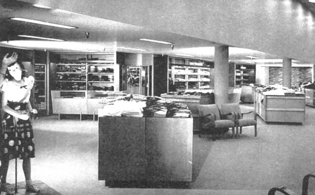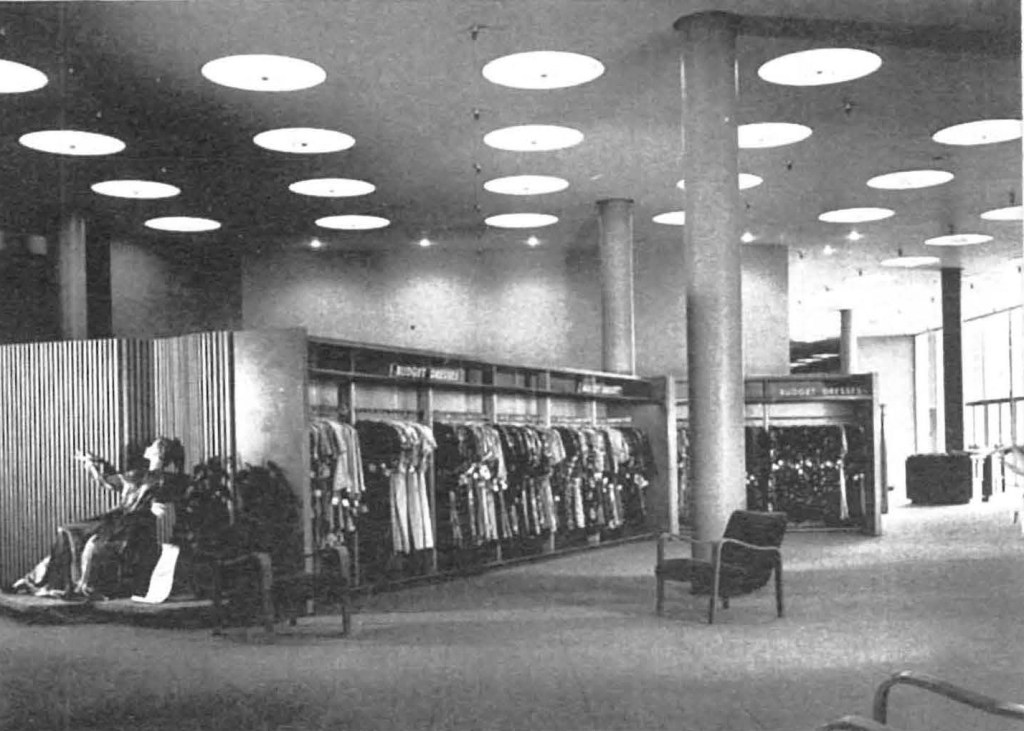 Client originally desired three story building but accepted, upon architect’s recommendation, one story layout for the following reasons: (1.) Constructions costs were lower mostly because of savings in vertical transportation and because of simpler construction materials, (2.) Operation of store is considerably cheaper because of easy supervision and low service cost, (3.) Economy in space was achieved because of reduced loss for traffic areas, (4.) Conditions for merchandising layout are more favorable because of better possibility for correlation of departments.