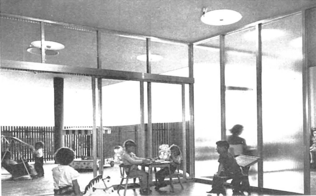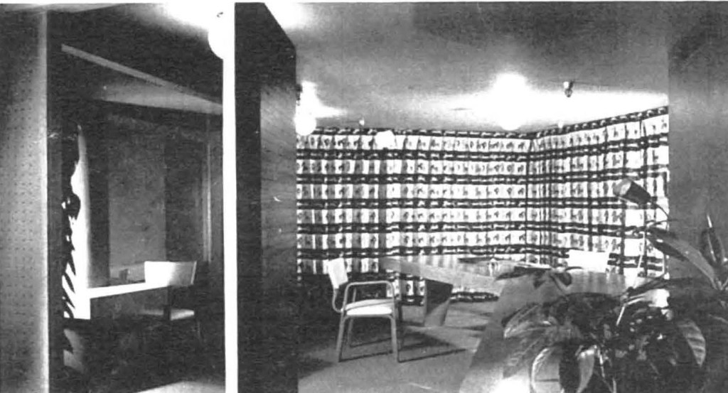 The colors play an important role in the building [too bad all the photos are black and white]. In the interior they are used for orientation. The four merchandising sectors are named, in accordance with their basic color theme, The Yellow, Rose, Blue and Green stores. The circular center portion has gray as a basic color theme. Exterior colors are dark green for fins, natural red for brick walls, white for roof overhangs, yellow and cocoa brown for solid wall partitions.
